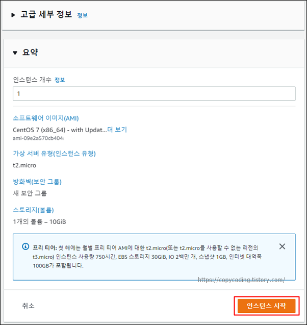 나머지 고급 세부 정보 설정은 돈이 들 수 있으니 그냥 놔두고 [인스턴스 시작]버튼을 클릭 합니다.