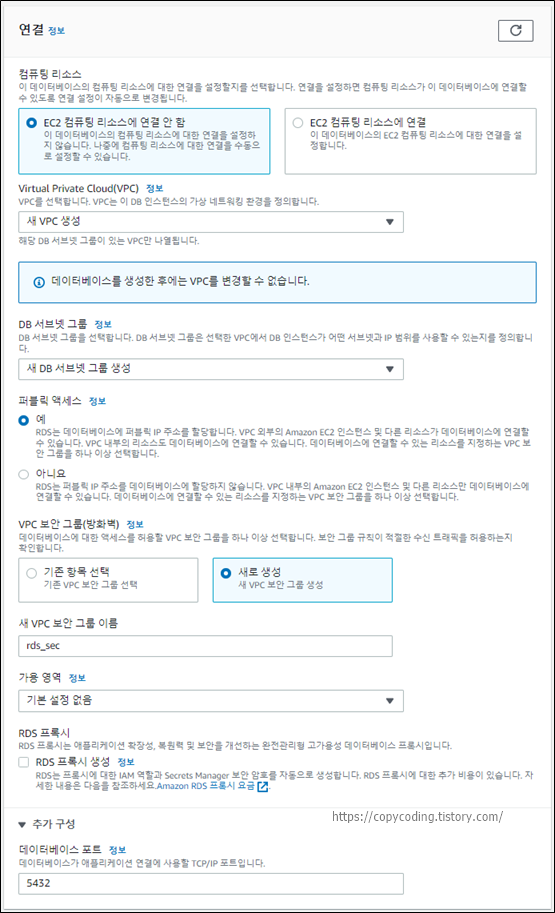 연결 설정은 RDS를 신규로 작성해서 사용하거나 기존에 EC2를 생성했고 EC2에서 연결해서 사용하려는 것인지에 따라 선택을 달리 하면 됩니다.