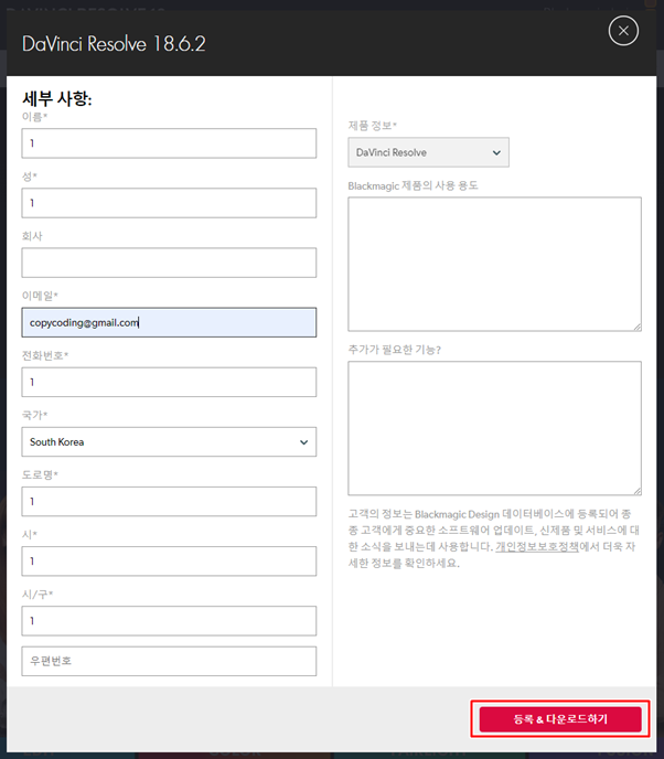 간단한 개인정보를 등록하라고 하는데 형식적인 것으로 모두 1로 입력하고 메일 주소도 형식만 갖추면 test@test.com 이렇게 해도 다운로드가 가능 합니다.
