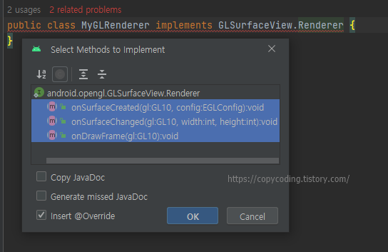 Google에 있는대로 MyGLRenderer.java 파일을 생성하고