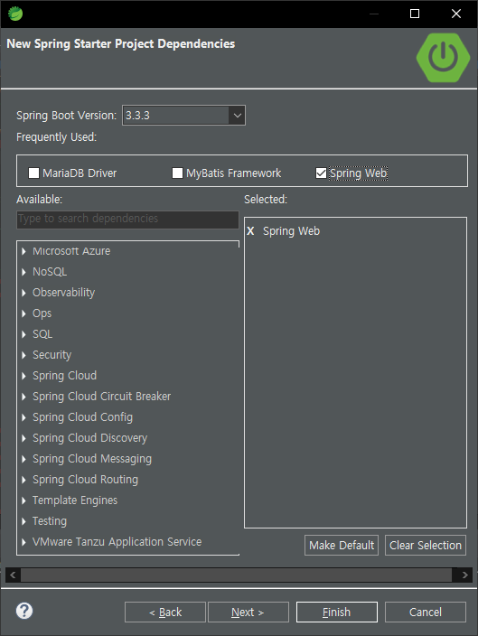 Dependency에서는 간단한 테스트 용이라 Web만 선택했습니다.