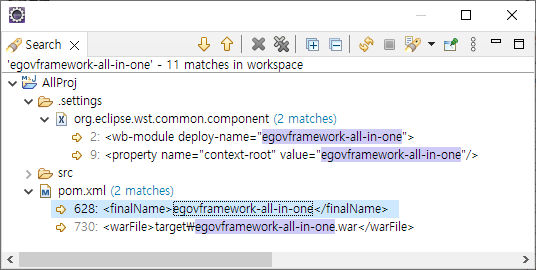 이렇게 4곳만 egovframework-all-in-one 을 AllProj 으로 수정해 줍니다.