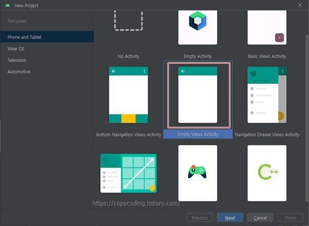 OpenGL ES 버전별로 지원하는 안드로이드 버전에 차이가 있는데 저는 OpenGL ES 3.0을 기준으로 작업을 진행 합니다.프로젝트를 생성할 때 버전에 맞추어 선택을 합니다.