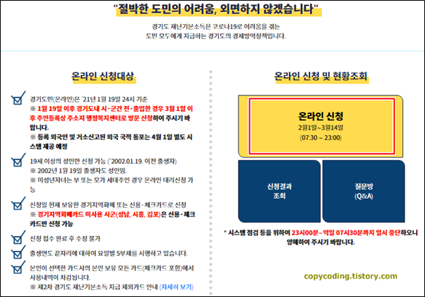경기도 제 2차 재난지원금(재난기본소득) 신청 기간이 2월 1일부터 시작 되었는데 출생년도 끝자리에 요일을 맞추어 신청 하다 보니 기간이 지나가 버렸네요. 그래서 그냥 아무나 신청 가능한 주말에 신청을 해 보았습니다. 신청 방법은 간단 합니다. 그리고 신청은 본인 확인과 사용할 카드를 등록하는 정도이고 실제 사용할 카드 번호를 등록 하는 건 아닙니다.