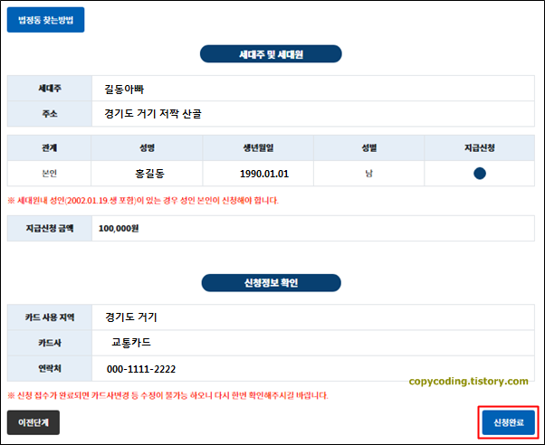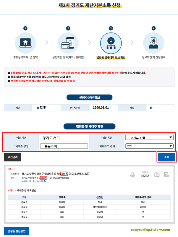 신청인 정보를 확인 하고 세대주, 주소 등을 선택한 후 [조회] 버튼을 선택하면 선택사항 확인이 진행 되며 잠시 후 하단에 상세 선택 정보를 보여줍니다.