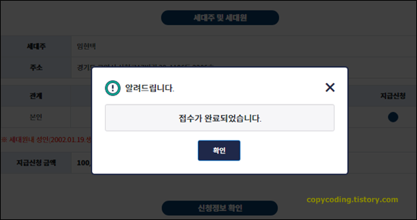 접수 완료 팝업이 보입니다. [확인]을 눌러야 겠죠.