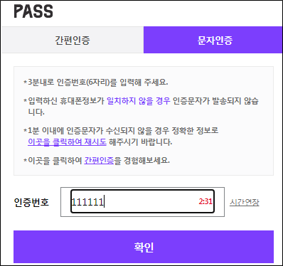 핸드폰에 날라온 문자에서 [인증번호]를 입력 하고 [확인] 버튼을 클릭하면 다시 메인 페이지로 이동을 하게 됩니다.