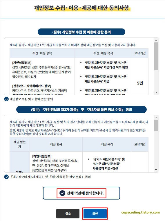 개인정보 수집 동의입니다. 약관에 동의하지 않으면 진행을 할 수 없으니 맨 아래에 있는 [전체 약관에 동의합니다.]를 선택 하면 전체 체크가 됩니다. 그리고 [확인] 버튼을 클릭 합니다.