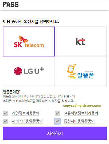 사용하는 [통신사]를 선택 하고 [동의사항]을 전체 체크한 후 [시작하기] 버튼을 클릭 합니다.
