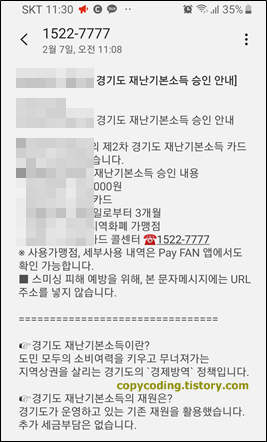 신청이 완료 되었습니다. 아래에 있는 글을 읽어 보면 2~3일 이내에 카드사에서 문자가 온다고 되어 있습니다. 저는 토요일에 신청 했는데 일요일에 카드사에서 문자가 도착 했습니다.