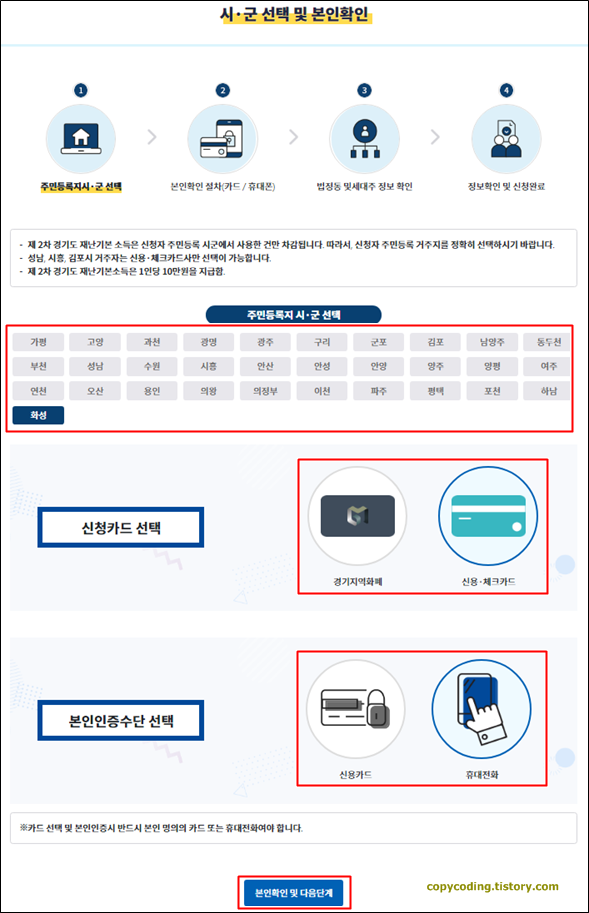 사는 동내와 신청카드 그리고 인증수단을 선택 하고 [본인확인 및 다음단계]를 클릭 합니다.