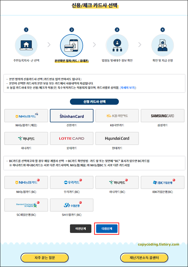 여기서는 본인이 사용하는 카드를 선택하는 단계로 그냥 등록할 카드를 선택 하고 [다음단계] 버튼을 클릭 합니다.