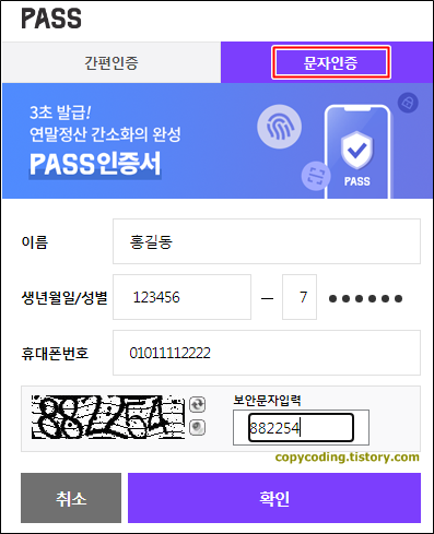 이름과 생년월일등을 입력 하고 [확인] 버튼을 클릭 합니다.