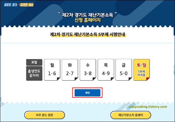 요일 별 신청 가능 출생연도를 설명하는 화면인데 주말에는 그냥 [확인] 버튼을 클릭 하면 됩니다.