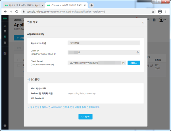 인증 정보 팝업에서 [Client ID]를 복사해 잘 보관 합니다. 이 ID가 있어야 앱에서 네이버 맵을 불러올 수 있습니다.