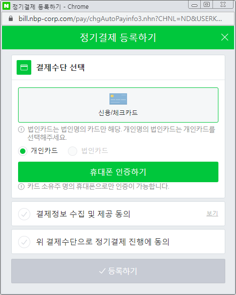 [휴대폰 인증하기]로 결제카드를 등록 합니다.