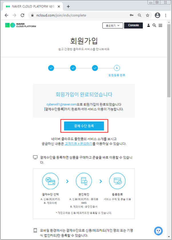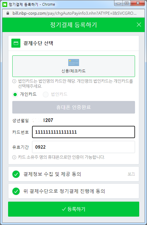 카드정보를 입력하고 [등록하기] 버튼을 클릭 합니다.
