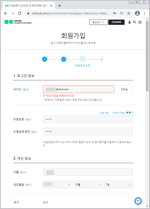 회원 정보를 입력합니다. 아이디는 메일 주소로 입력해야 하고 인증을 위해 전송 버튼을 클릭하여 발송된 메일을 클릭 해야 하니 정확히 입력해야 합니다. 메일 인증을 위해 입력한 아이디의 메일을 확인해 봅니다.