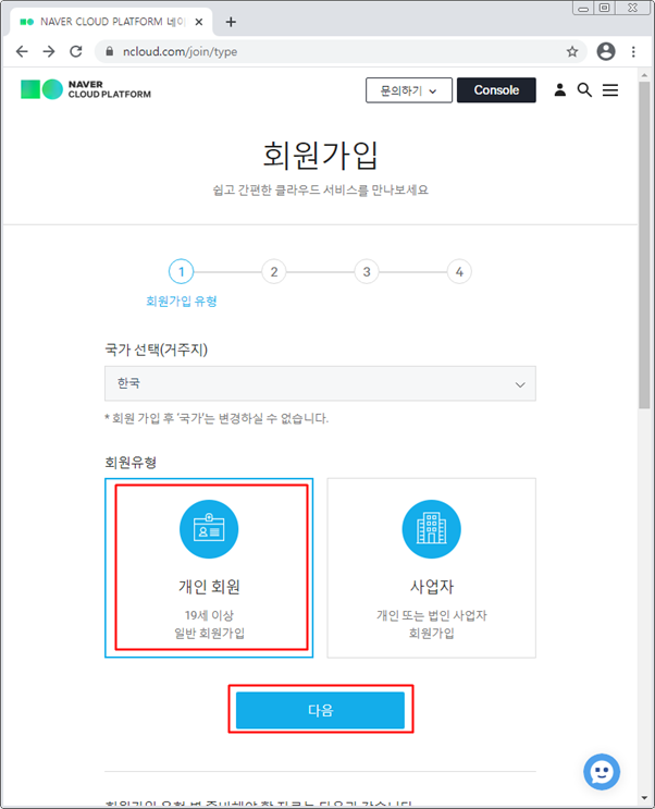 [회원가입] 화면에서 개인 회원 또는 사업자를 클릭 합니다. 저는 [개인 회원]을 선택하고 [다음] 버튼을 클릭 하였습니다.