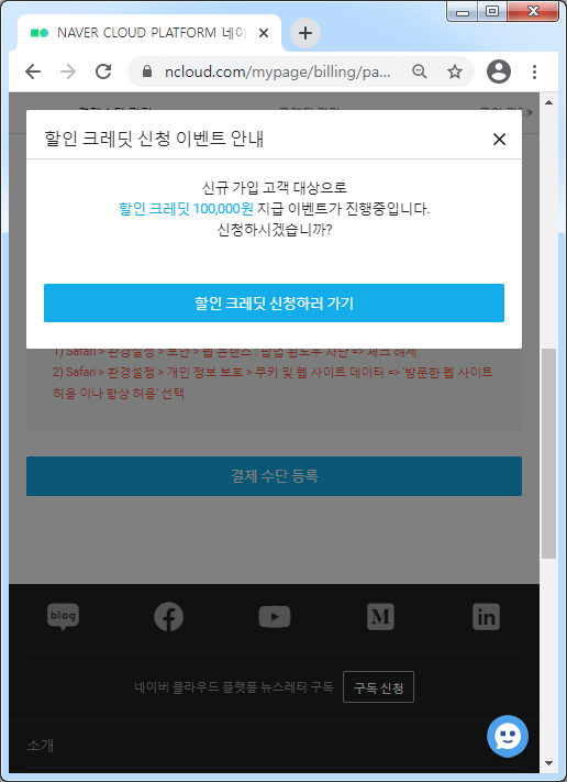 10만원 상당의 크레딧을 제공한다고 하는데 필요하면 신청을 합니다. 단 유효 기간은 3개월 입니다.