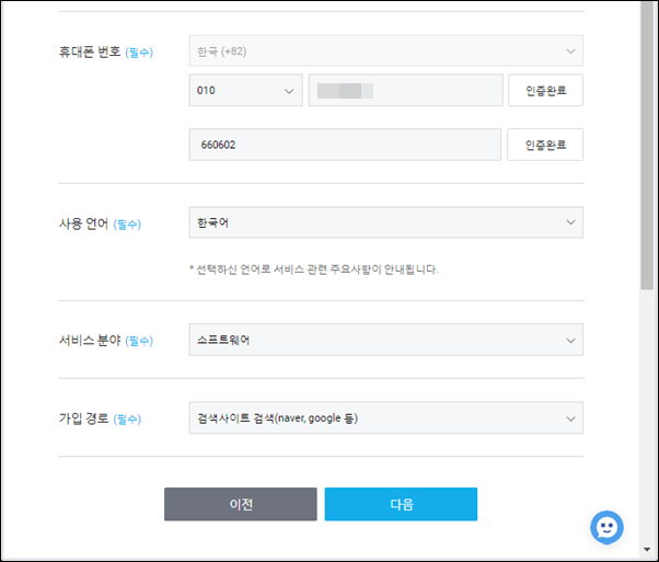 나머지 주소 및 회원 정보도 입력을 하고 휴대폰 번호도 인증을 한 후 [다음] 버튼을 클릭합니다.