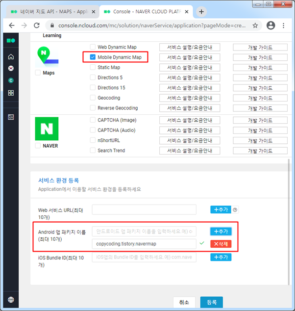 모바일 맵을 사용 하기한 등록을 시작 합니다. [Mobile Dynamic Map]을 체크하고 안드로이드 앱 패키지 이름도 등록합니다. 등록시 [추가] 버튼을 클릭해야 등록 됩니다. 패키지를 입력했으면 [등록] 버튼을 클릭합니다.