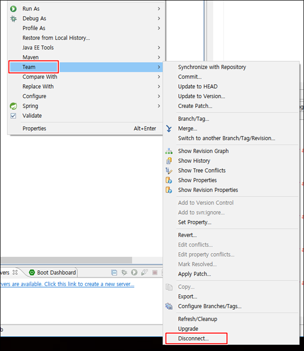 프로젝트에 마우스를 대고 우클릭 > Team > Disconnect