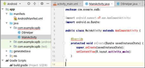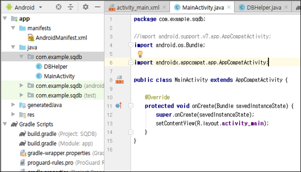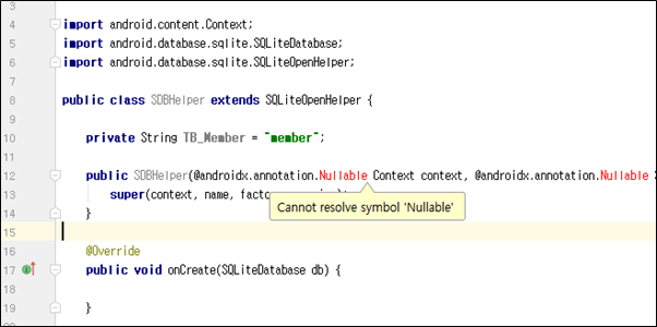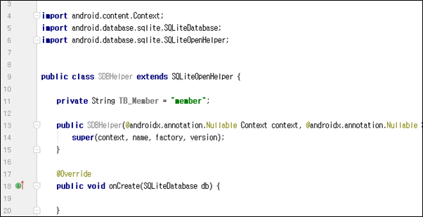 | public class SDBHelper extends SQLiteOpenHelper { private String TB_Member = "member"; public SDBHelper(@androidx.annotation.Nullable Context context, @androidx.annotation.Nullable String name, @androidx.annotation.Nullable SQLiteDatabase.CursorFactory factory, int version) { super(context, name, factory, version); } |