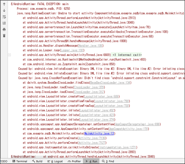 layout에 문제가 있다고 하네요. Layout 파일에서 오류를 찾아 봅시다.