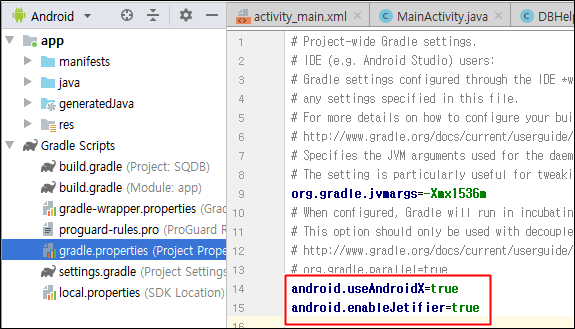 gradle.properties에 androidx를 사용하기 위해 추가 합니다.