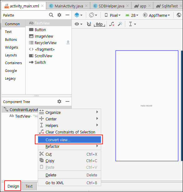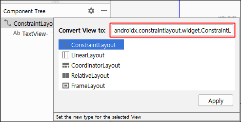 Design > Component Tree > ConstraintLayout > 마우스 우클릭 > Convert view...