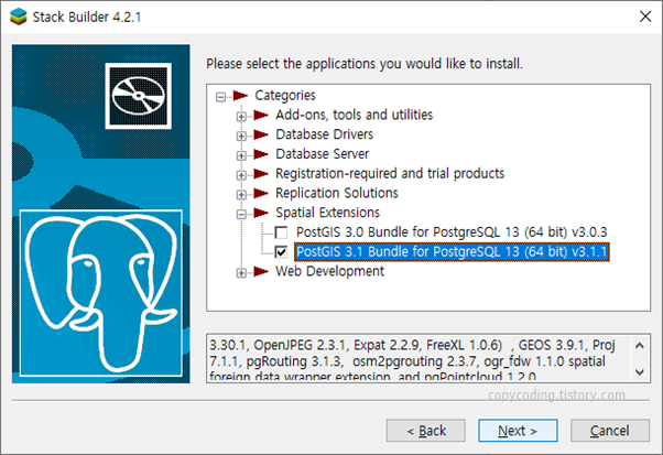 추가로 설치 하려는 PostGIS 3.1을 선택 하고 그외에도 필요한 확장 프로그램이 있으면 선택해 줍니다.