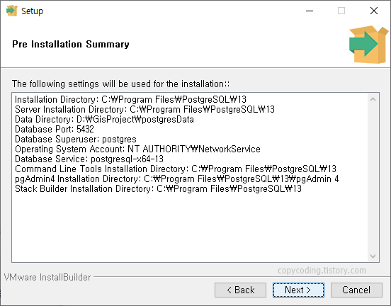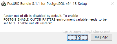 나중에 pgAdmin 프로그램으로 DB에 접속할 때 사용하는 관리자 계정 비밀번호로 잘 기억해 둡니다.