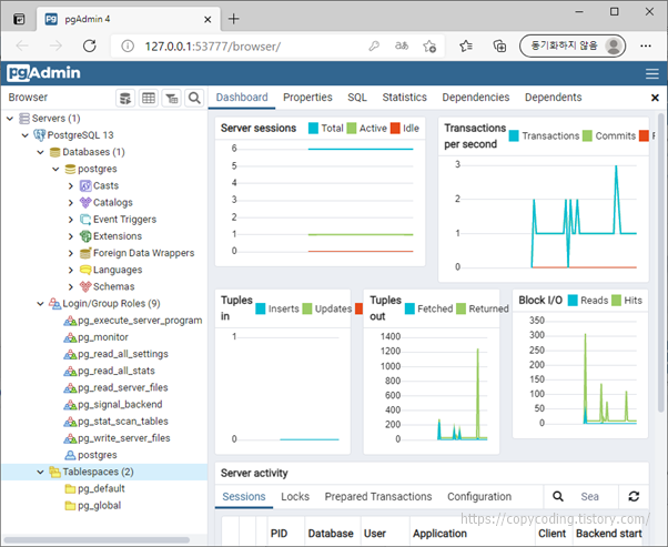 pgAdmkin 4를 선택해서 DB도 확인합니다. 프로그램을 브라우저에서 작동 합니다.