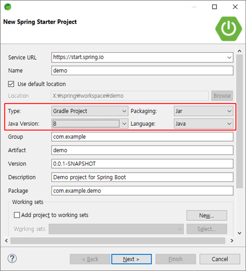Type, Packaging, Java Version, Languageㅇ 4개를 자신의 취향에 맞도록 수정 가능 합니다. 요즘에는 Maven 보다 Gradle을 많이 사용하니 Gradle로 설정을 해서 생성합니다.