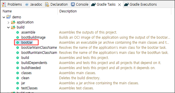 Gradle Tasks를 열고 bootJar를 더블클릭 합니다. 빌드가 완료되면