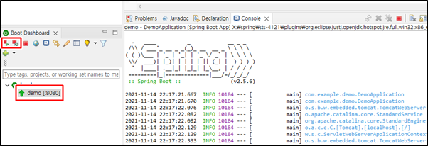 툴의 좌측 하단에서 demo 를 선택 하고 빨간색 네모 둘중 하나를(실행, 디버깅) 클릭하면 embeded tomcat이 8080으로 잘 실행 되었다고 우측에 표시 됩니다.