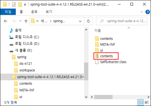 jar 형태의 압축파일을 풀고 contents.zip 압축파일도 풀어주면 sts-4.12.1 폴더를 얻을 수 있습니다. 압축은 zip 파일을 풀드시 일반적인 툴을 이용합니다.