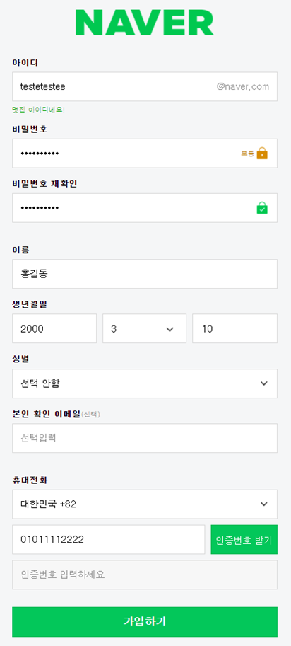 휴대전화 인증번호 받기만 하면 [가입하기] 버튼을 눌러주는 것으로 가입절차가 완료됩니다.