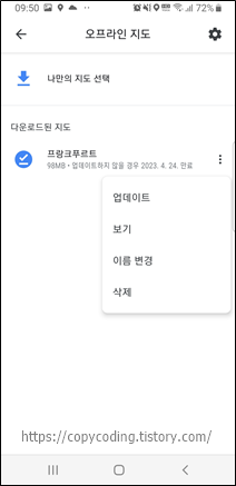 추가적인 기능을 사용하려면 우측의 점 3개를 클릭하면 됩니다. 저장된 지도에 대한 추가 기능은 4가지로 업데이트, 보기, 이름 변경, 삭제 입니다.