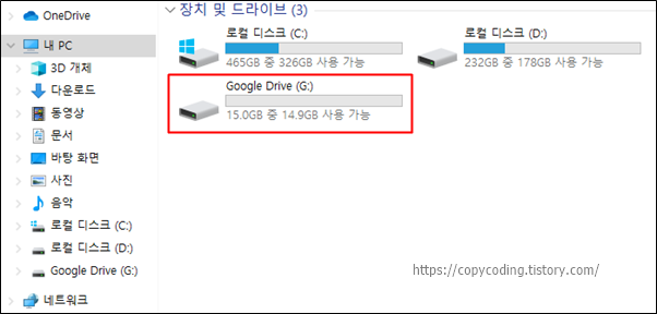 예전에는 자주 사용하는 문서를 USB는 가지고 다녀야 해서 귀찮아 메일로 보내놓고 사용했었는데 이제는 클라우드에 무료로 저장공간을 제공하는 회사가 많아져서 편리하게 사용하고 있습니다.구글에서 제공하는 드라이브는 웹에서 사용할 수도 있지만 프로그램을 설치하면 내 컴퓨터의 저장공간처럼 파일 탐색기를 이용하여 사용이 가능합니다.