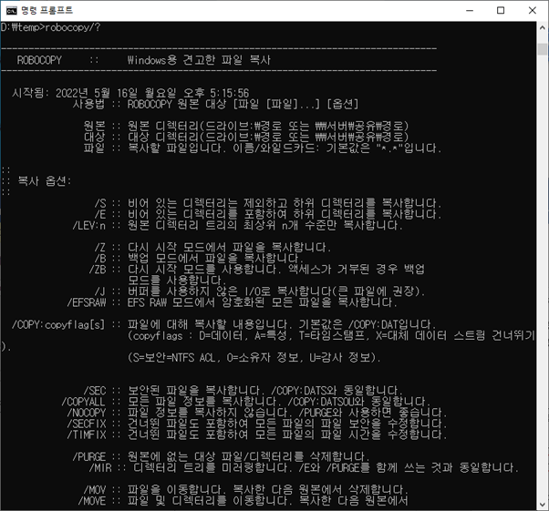 robocopy의 자세한 옵션은 콘솔에서 찾아볼 수 있습니다.