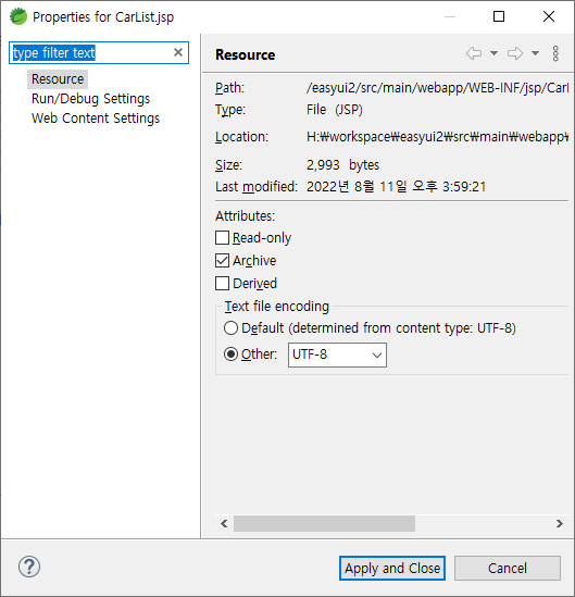 여기서 하단 Default encoding을 UTF-8로 입력하고 JSP도 UTF-8로 다시 원복.