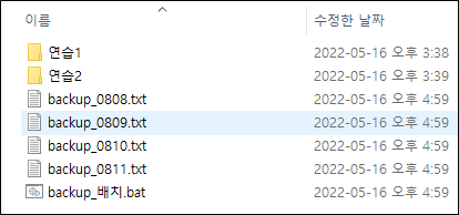 | backup_0808.txt/ 2022-05-16 04:59 오후/ 242bytes backup_0809.txt/ 2022-05-16 04:59 오후/ 242bytes backup_0810.txt/ 2022-05-16 04:59 오후/ 242bytes backup_0811.txt/ 2022-05-16 04:59 오후/ 242bytes backup_배치.bat/ 2022-05-16 04:59 오후/ 242bytes 연습1 DIR 연습2 DIR |