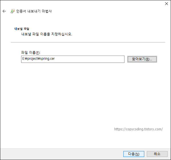 DER로 인코딩된 바이너리 X.509가 기본으로 선택 되어있을 텐데 아니라면 선택을 하고 [다음] 버튼을 클릭 합니다.