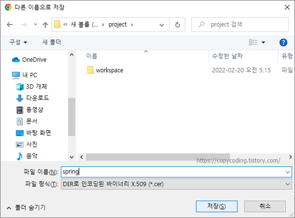 인증서를 저장할 위치와 이름을 임의대로 입력하고 [저장] 버튼을 클릭 합니다.