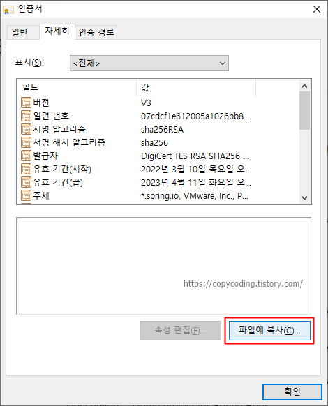 인증서에 대한 설명이 나오고 버튼들도 보입니다. 저장해야 하니 [파일에 복사] 버튼을 클릭 합니다.