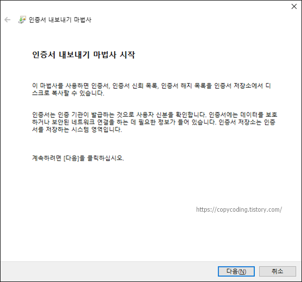 저장을 위한 인증서 내보내기 마법사 창이 나오면 [다음] 버튼을 클릭하고