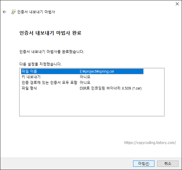 [마침] 버튼을 클릭 해서 인증서를 저장 합니다.