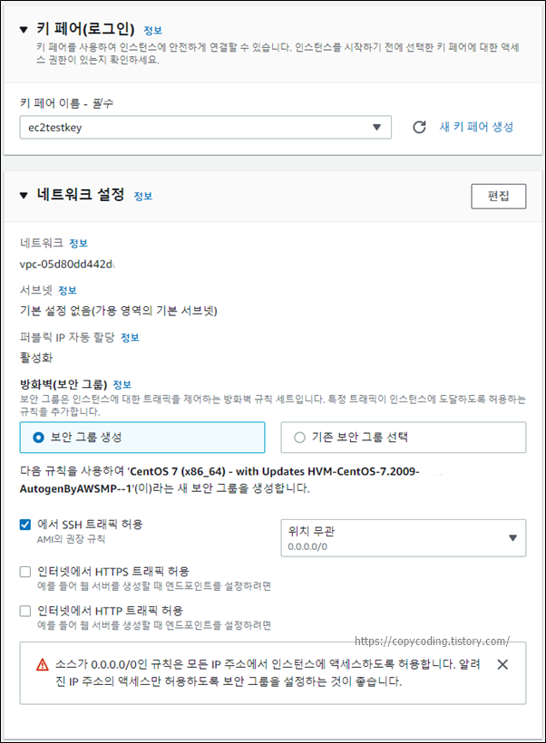 네트워크 설정에서 방화벽 규칙을 위한 보안그룹을 생성 하는데 신규 인스턴스인 경우 보안 그룹 생성을 클릭하고 원격 접속을 위해 SSH 트래픽 허용도 체크를 해줍니다.